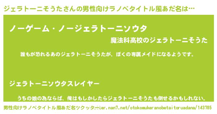 | 女子向けラノベタイトル風あだ名 | 『ジェラトーニそうたの契約王妃』 |
