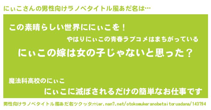 | 女子向けラノベタイトル風あだ名 | 『にぃこ様がみてる』『にぃこ伯爵の花嫁』 |