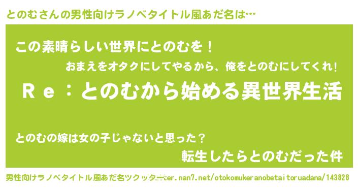 | 女子向けラノベタイトル風あだ名 | 『闇のとのむ』『とのむ夫妻のなれそめ』 |