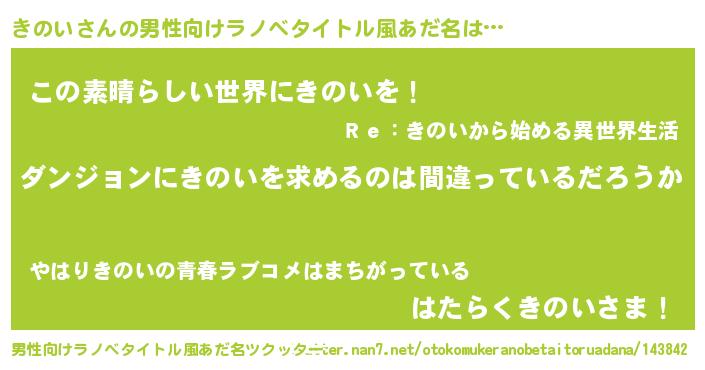 | 女子向けラノベタイトル風あだ名 | 『きのいは平凡を望む』『闇のきのい』 |