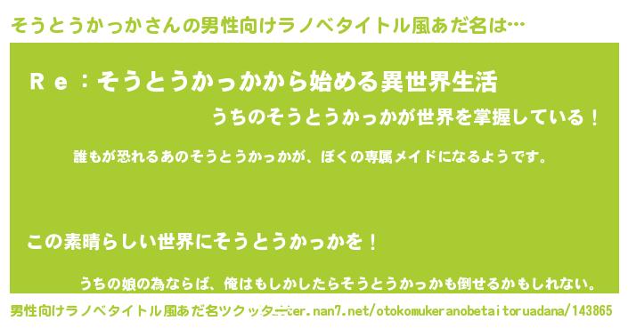 | 女子向けラノベタイトル風あだ名 | 『異世界でカフェそうとうかっかを開店しました。』 |