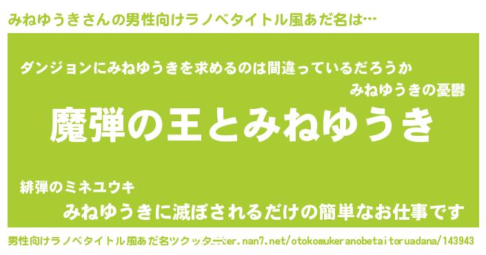 | 女子向けラノベタイトル風あだ名 | 『みねゆうきが死なない童話 林檎のみねゆうきの診療簿』 |