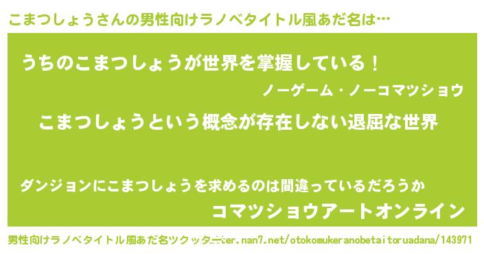 | 胡散臭い通販商品みたいなあだ名 | 『絶対に幸福をもたらす健康食品…その名も「こまつしょう」』 |
