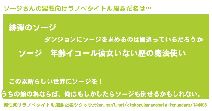 | 女子向けラノベタイトル風あだ名 | 『ソージの玉の輿計画!』 |