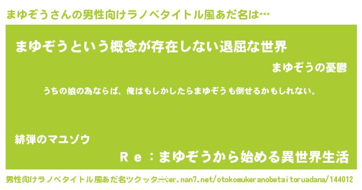 | 胡散臭い通販商品みたいなあだ名 | 『運命の人と巡り会える高級そうな皿…その名も「まゆぞう」』 |