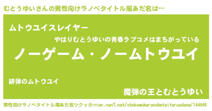 | ヒーロー風カッコイイあだ名 | 『慈愛の使者むとうゆい』『仮面ムトダー』 |