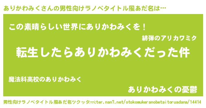 | 女子向けラノベタイトル風あだ名 | 『ありかわみくの玉の輿計画!』 |