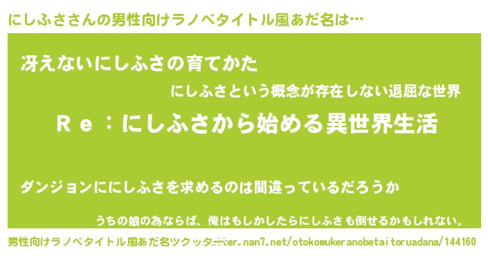 | 女子向けラノベタイトル風あだ名 | 『闇のにしふさ』『にしふさ伯爵の花嫁』 |
