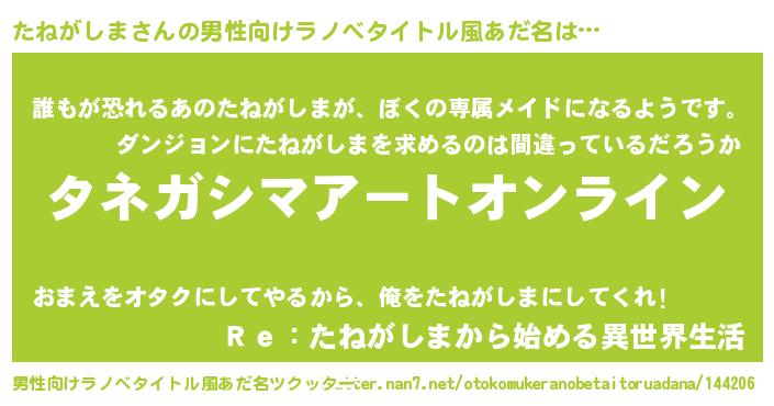 | 女子向けラノベタイトル風あだ名 | 『誰かこのたねがしまを説明してください! ~契約から始まるウェディング~』 |