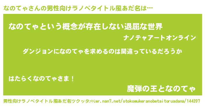 | 女子向けラノベタイトル風あだ名 | 『なのてゃの卵を拾いまして』 |