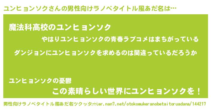 | 女子向けラノベタイトル風あだ名 | 『ユンヒョンソクの卵を拾いまして』 |