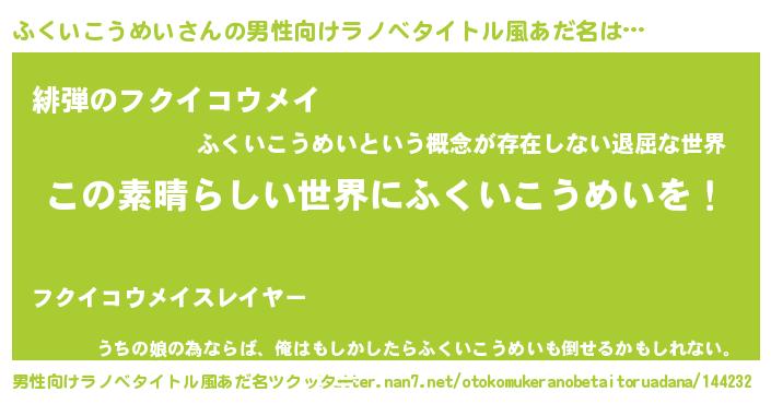 | 胡散臭い通販商品みたいなあだ名 | 『あなたにだけ特別に提供する100年もののヴィンテージワイン…その名も「ふくいこうめい」』 |