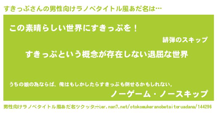| 女子向けラノベタイトル風あだ名 | 『異世界で失敗しない100のすきっぷ』 |