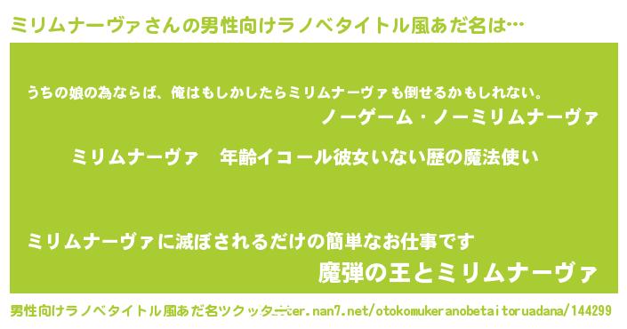 | 女子向けラノベタイトル風あだ名 | 『ミリムナーヴァの玉の輿計画!』 |