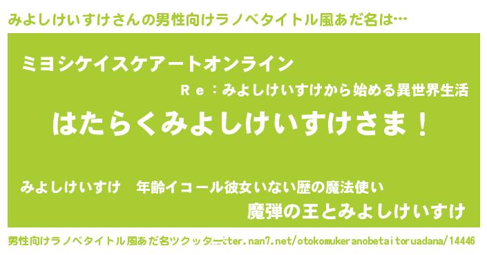 | 胡散臭い通販商品みたいなあだ名 | 『必ず成功するブレスレット…その名も「みよしけいすけ」』 |
