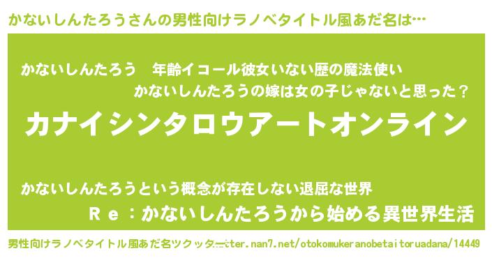 | 女子向けラノベタイトル風あだ名 | 『誰かこのかないしんたろうを説明してください! ~契約から始まるウェディング~』 |
