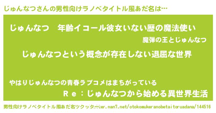 | 女子向けラノベタイトル風あだ名 | 『異世界で失敗しない100のじゅんなつ』 |