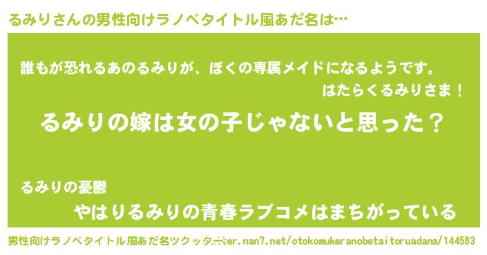 | 女子向けラノベタイトル風あだ名 | 『るみりの卵を拾いまして』 |
