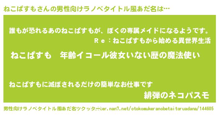 | 女子向けラノベタイトル風あだ名 | 『ねこぱすもの玉の輿計画!』 |