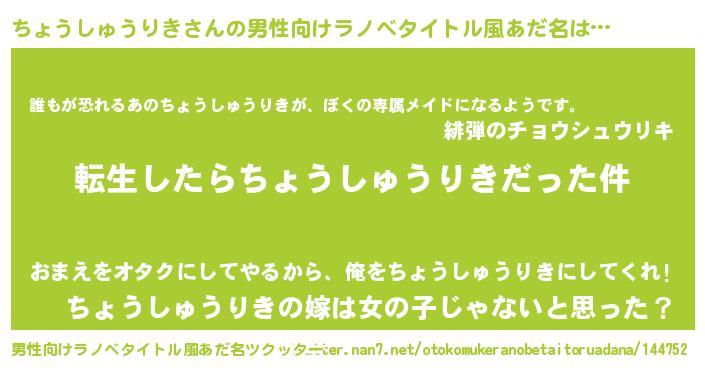 | ヘコむあだ名 | 『ちょうしゅうりき(爆)』『ちょっぺ』 |