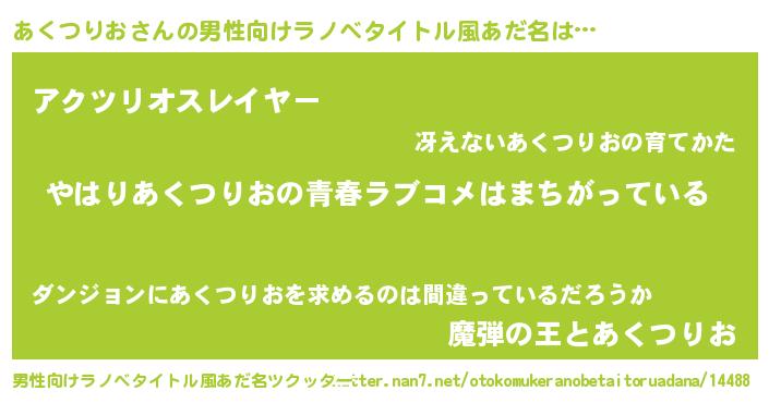 | 女子向けラノベタイトル風あだ名 | 『あくつりおの雑貨屋さん』 |