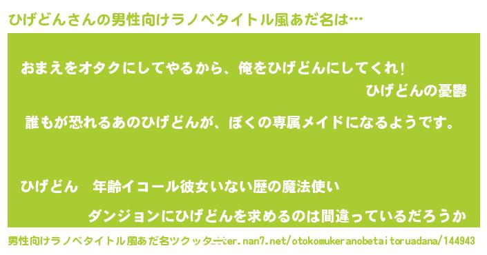 | 胡散臭い通販商品みたいなあだ名 | 『来世でも幸せになれる水素水…その名も「ひげどん」』 |