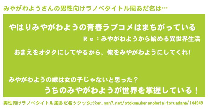 | 女子向けラノベタイトル風あだ名 | 『みやがわよう夫妻のなれそめ』 |