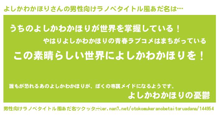 | 女子向けラノベタイトル風あだ名 | 『乙女ゲームの破滅フラグしかない悪役よしかわかほりに転生してしまった…』 |