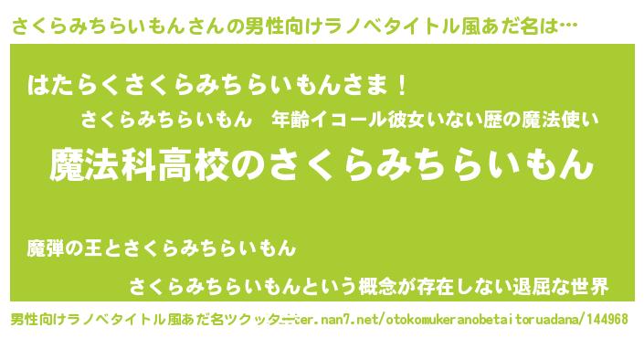 | 胡散臭い通販商品みたいなあだ名 | 『ガンによく効く高麗人参…その名も「さくらみちらいもん」』 |