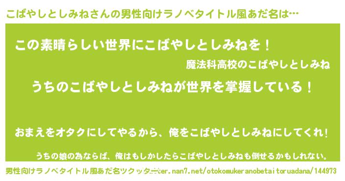 | 胡散臭い通販商品みたいなあだ名 | 『あなたにだけ特別に提供する100年もののヴィンテージワイン…その名も「こばやしとしみね」』 |