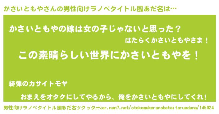 | 女子向けラノベタイトル風あだ名 | 『乙女ゲームの破滅フラグしかない悪役かさいともやに転生してしまった…』 |