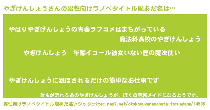 | 女子向けラノベタイトル風あだ名 | 『やぎけんしょうの玉の輿計画!』 |