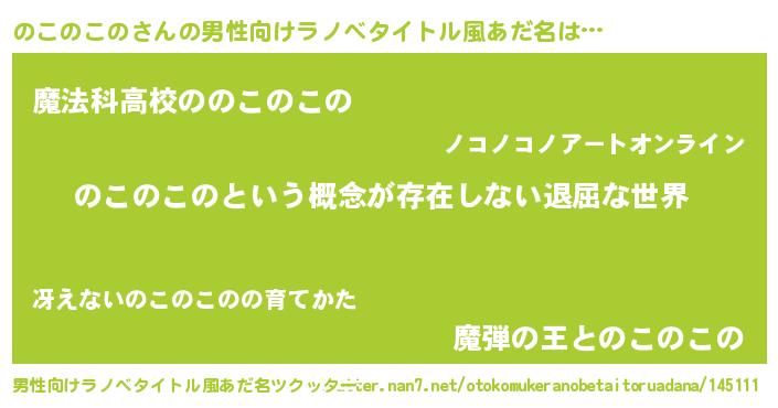 | 女子向けラノベタイトル風あだ名 | 『異世界で失敗しない100ののこのこの』 |