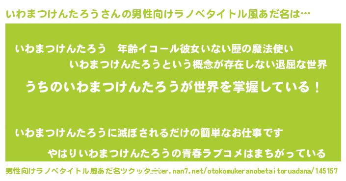 | 女子向けラノベタイトル風あだ名 | 『男装いわまつけんたろうの憂鬱な任務』 |