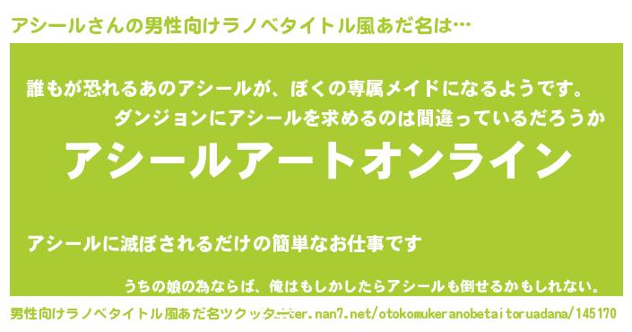 | 女子向けラノベタイトル風あだ名 | 『誰かこのアシールを説明してください! ~契約から始まるウェディング~』 |