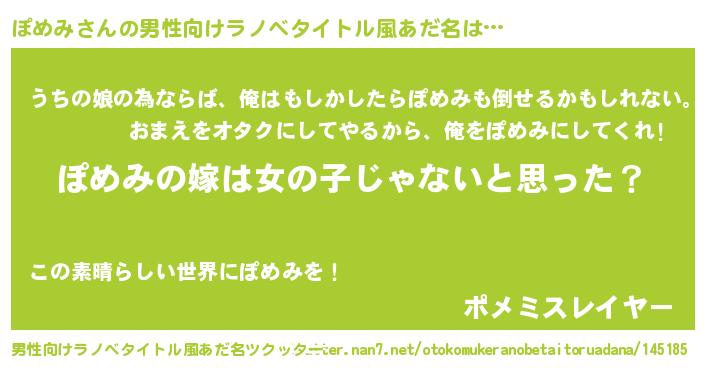 | 女子向けラノベタイトル風あだ名 | 『ぽめみ様がみてる』『ぽめみ伯爵の花嫁』 |