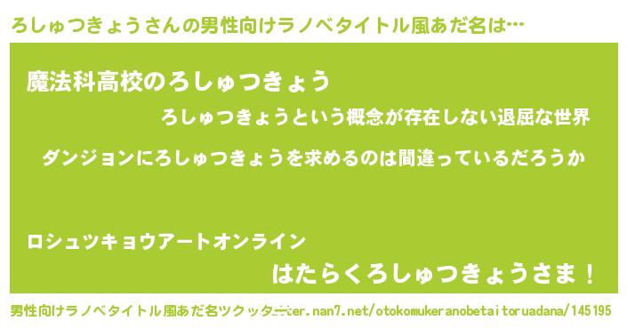| 女子向けラノベタイトル風あだ名 | 『ろしゅつきょうの卵を拾いまして』 |