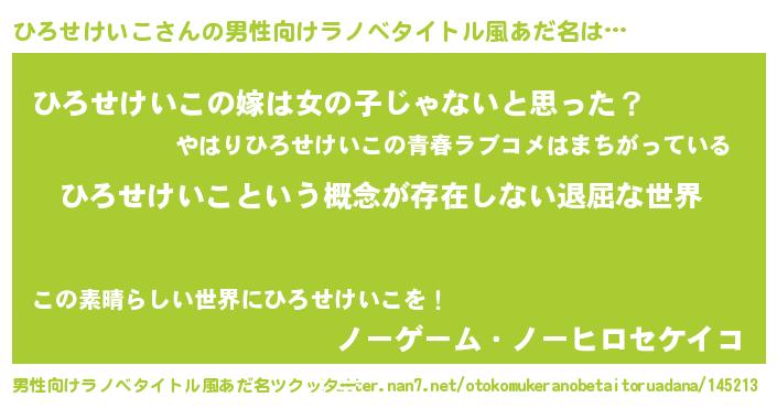 | 女子向けラノベタイトル風あだ名 | 『ひろせけいこの契約王妃』 |