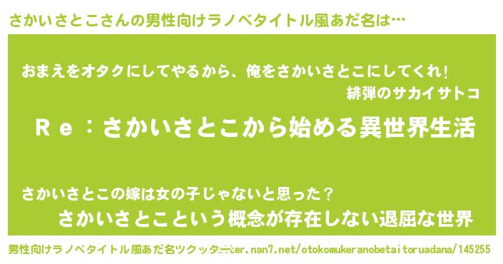 | ヒーロー風カッコイイあだ名 | 『究極戦士サカイサトコ』『暗黒騎士サカ』 |