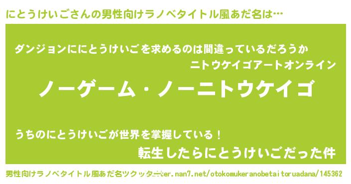 | ポケモン風あだ名 | 『ニックウザ』『ヒニトウケイゴ』 |