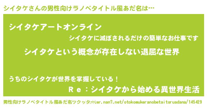 | 女子向けラノベタイトル風あだ名 | 『異世界で失敗しない100のシイタケ』 |
