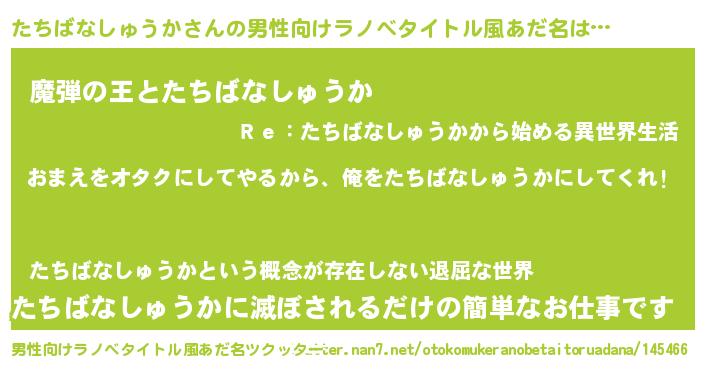 | 女子向けラノベタイトル風あだ名 | 『たちばなしゅうか夫妻のなれそめ』 |