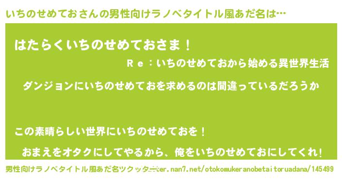 | 胡散臭い通販商品みたいなあだ名 | 『伝統あるサプリメント…その名も「いちのせめてお」』 |