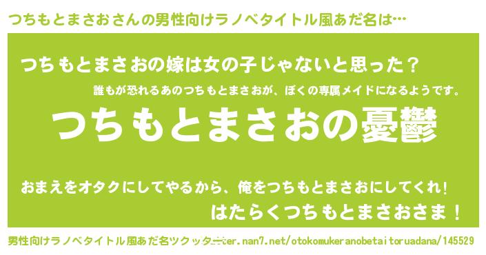 | 女子向けラノベタイトル風あだ名 | 『(仮)つちもとまさおのやんごとなき事情』 |
