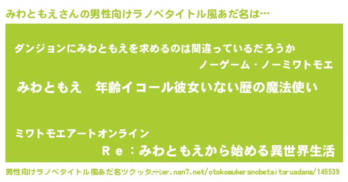 | 女子向けラノベタイトル風あだ名 | 『みわともえの玉の輿計画!』 |