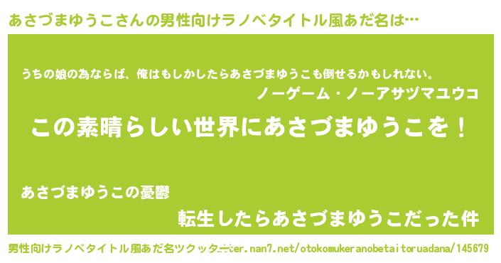 | 胡散臭い通販商品みたいなあだ名 | 『あなたにだけ特別に提供する世界で10本だけ現存している希少なブランデー…その名も「あさづまゆうこ」』 |