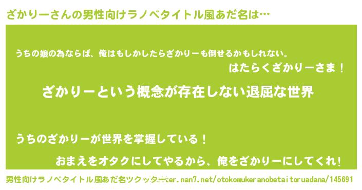 | 女子向けラノベタイトル風あだ名 | 『異世界で失敗しない100のざかりー』 |