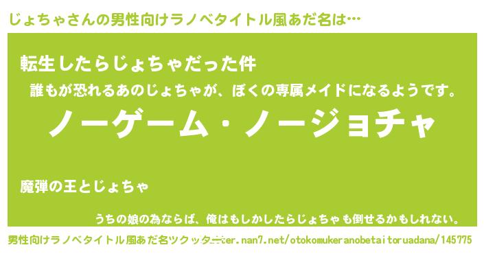 | 女子向けラノベタイトル風あだ名 | 『死神じょちゃの再婚』 |