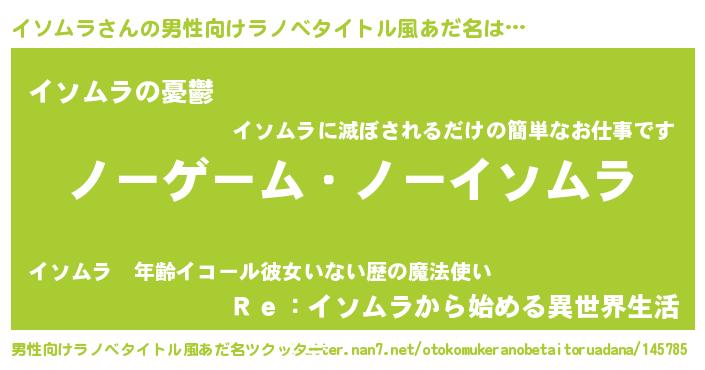 | 女子向けラノベタイトル風あだ名 | 『死神イソムラの再婚』『闇のイソムラ』 |