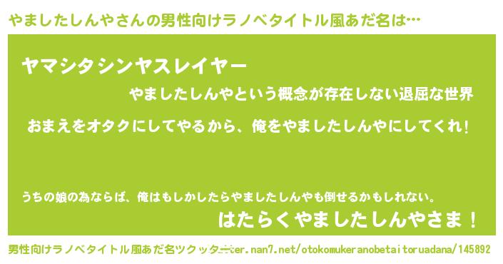 | 女子向けラノベタイトル風あだ名 | 『やましたしんや夫妻のなれそめ』 |